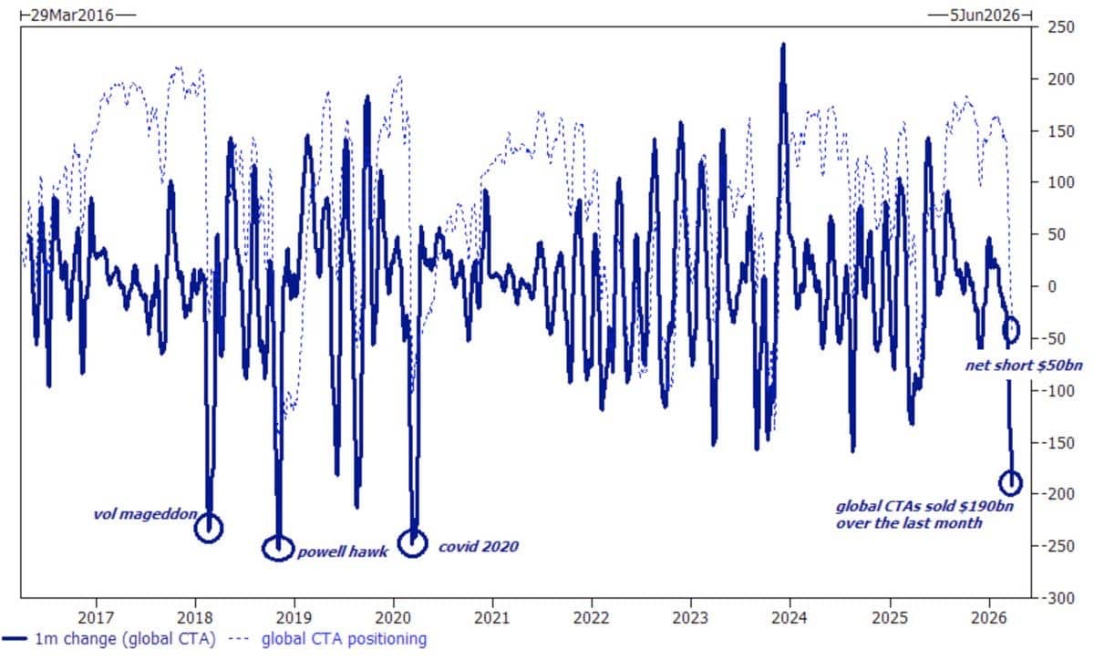 Proflex View: This is the final capitulation leg. What remains is structural positioning and long-term buyers. The math says most of the pain is priced in. The SPX level breaking confirmed the breakdown. Watch for a re-test of critical monthly SPX levels as resistance on any bounce. Five Weeks of Liquidation: Derivatives Driving the Drop In Week 11, we explained that $5 trillion in options were acting as "scaffolding" keeping selling orderly. It did and the last two weeks have been the result. What the market is experiencing now is textbook CTA and momentum liquidation. Institutional selling data from the last two weeks shows one of the worst readings on record. When volatility spikes above certain thresholds, algorithmic momentum strategies are forced sellers regardless of fundamentals. It's mechanical, not analytical — every sector, every index, selling together. The Nasdaq earlier was holding better than the S&P and refusing to make new lows, has now confirmed a secular downtrend across the board. Weak hands have been in control.