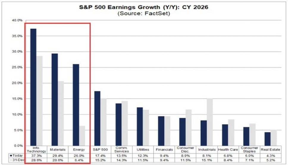 While the war dominates headlines, a structural counter-narrative is quietly building. Factset’s update for last week saw 2026 SPX earnings growth expectations increasing to +17.4%, up +1.1% the past two weeks and +2.6% since the start of the year.